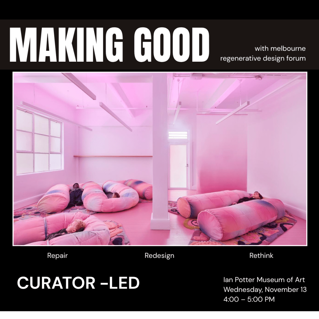 The Melbourne Regenerative Design Forum (MRDF) invites you to a special behind-the-scenes experience of the acclaimed NGV’s Making Good exhibition. Guided by the exhibit’s curator, Gemma Savio, this tour will explore how art intersects with regenerative design principles – from biodegradable packaging and air-purifying paints to clothing that grows with you and concrete made from coffee grounds.